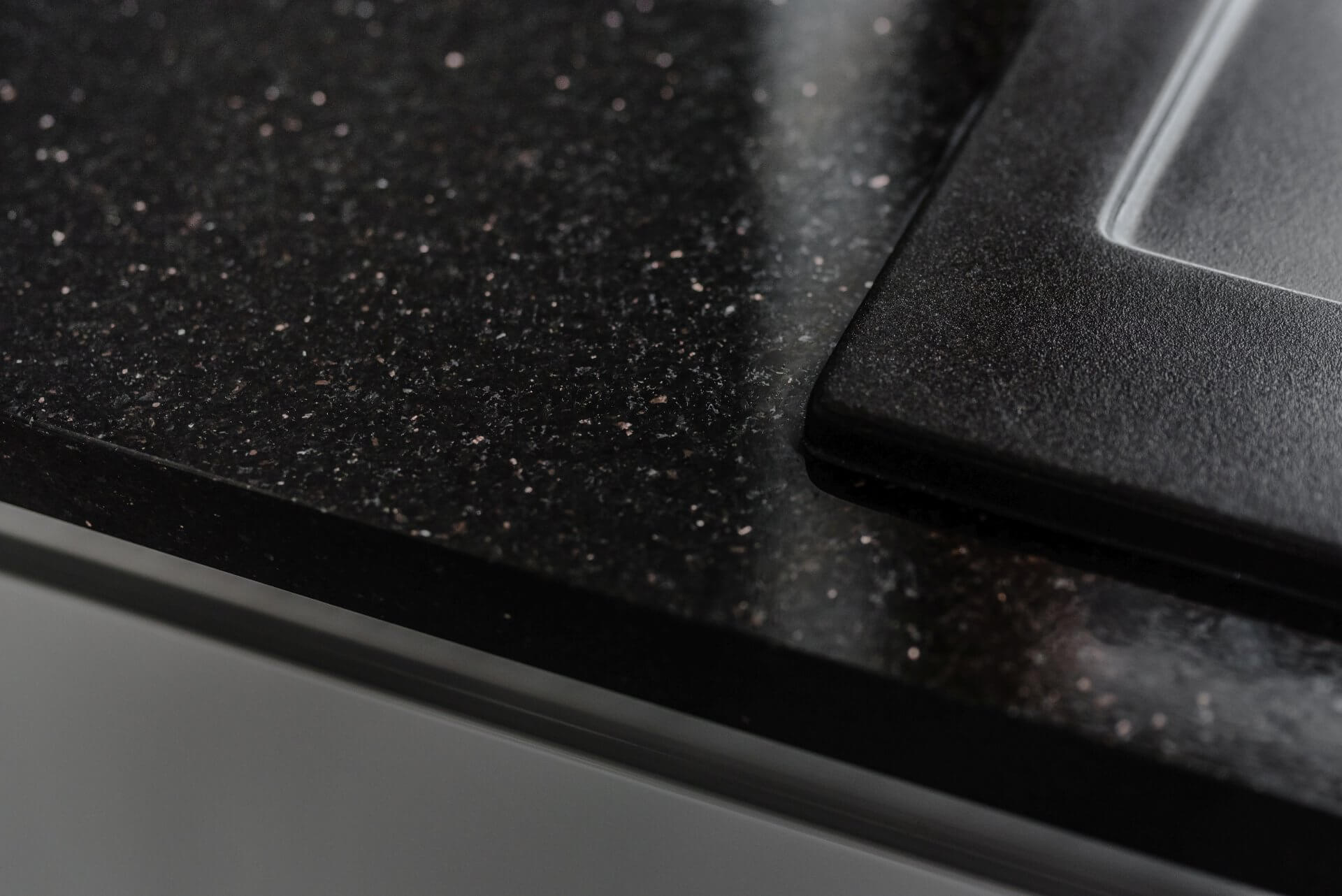 Czerń i biel zawsze w modzie. W poniższej realizacji wykorzystaliśmy lakierowane na wysoki połysk fronty z frezowanym uchwytem. Praktyczna zabudowa do sufitu z poziomym podziałem szafek górnych nadaje całości symetrii, którą podkreśla oświetlenie LED. Blat oczywiście granitowy – marki Galaxy Star, który idealnie komponuje się z bielą i czernią frontów. Do tego nowoczesny i niezawodny sprzęt AGD Bosch.