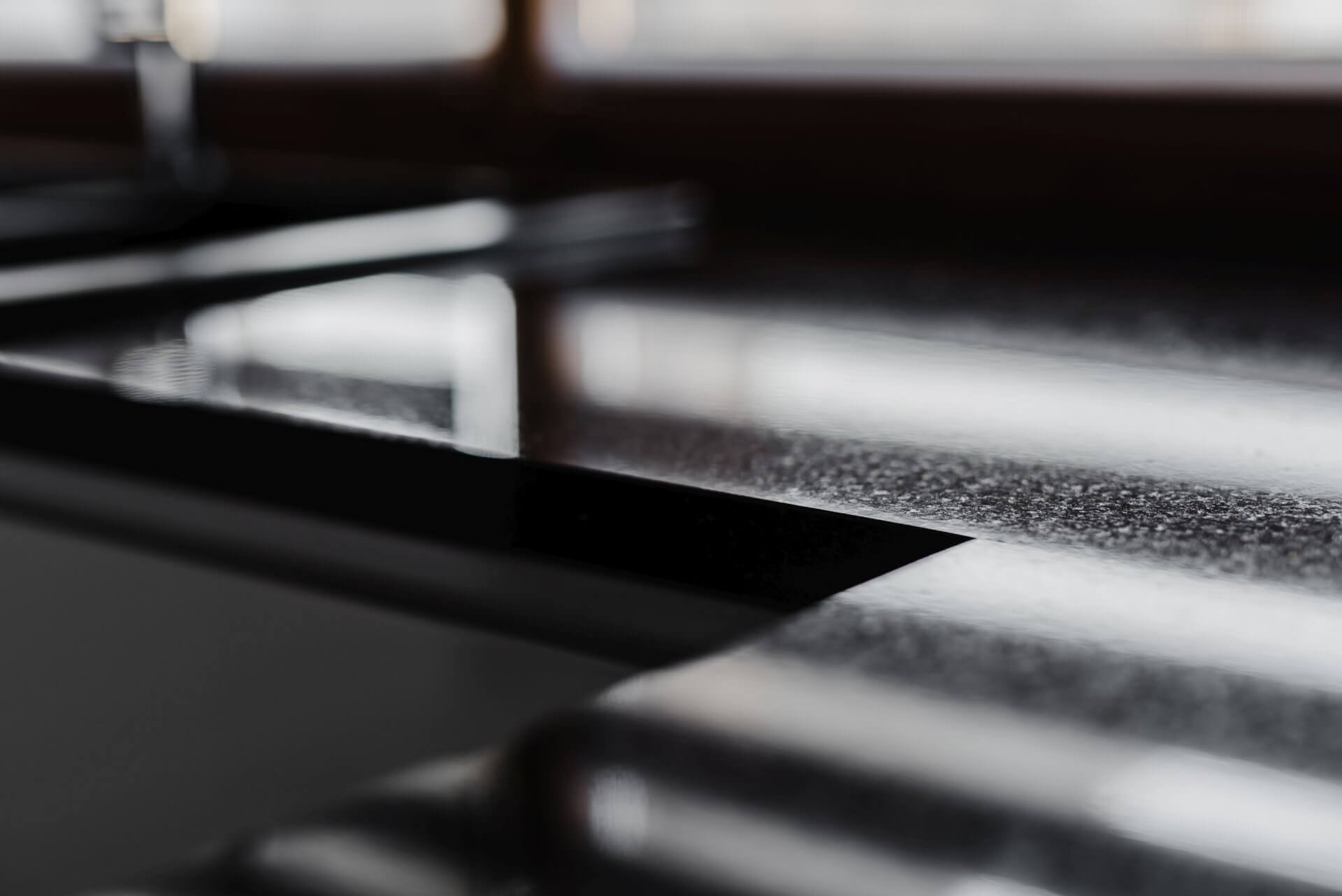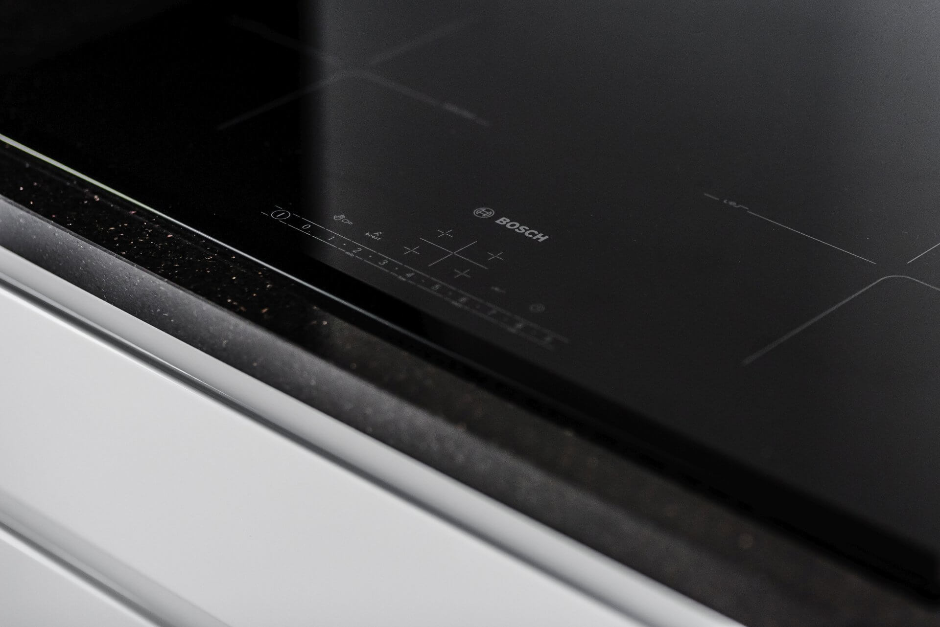 Czerń i biel zawsze w modzie. W poniższej realizacji wykorzystaliśmy lakierowane na wysoki połysk fronty z frezowanym uchwytem. Praktyczna zabudowa do sufitu z poziomym podziałem szafek górnych nadaje całości symetrii, którą podkreśla oświetlenie LED. Blat oczywiście granitowy – marki Galaxy Star, który idealnie komponuje się z bielą i czernią frontów. Do tego nowoczesny i niezawodny sprzęt AGD Bosch.